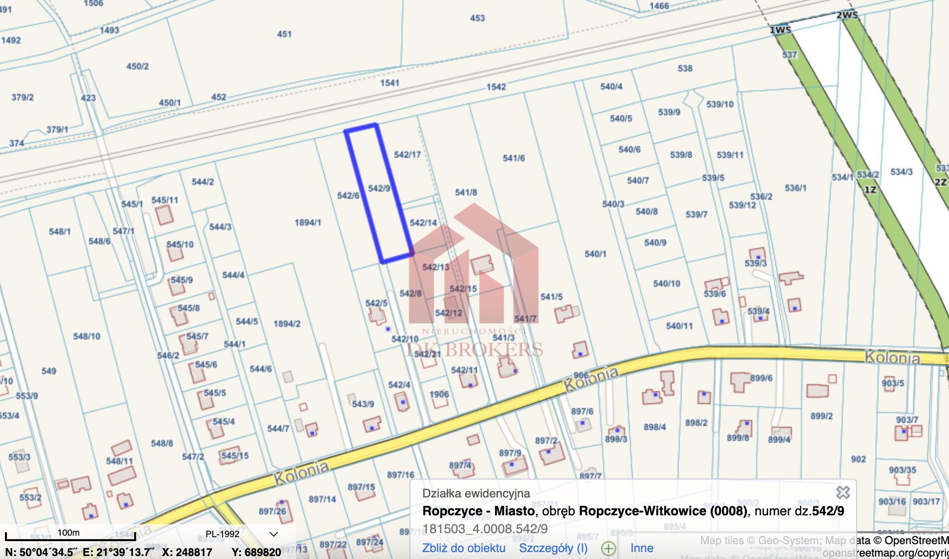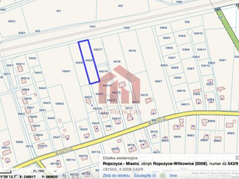 Działka posiada nr: 542/9 obr. 0008 Ropczyce – Witkowice.