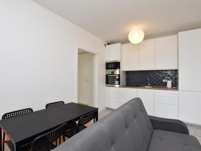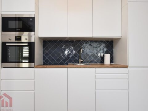 Kuchnia kompletnie wykończona i wyposażona w niezbędny sprzęt AGD (lodówkę, piekarnik, płytę indukcyjną, zmywarkę).