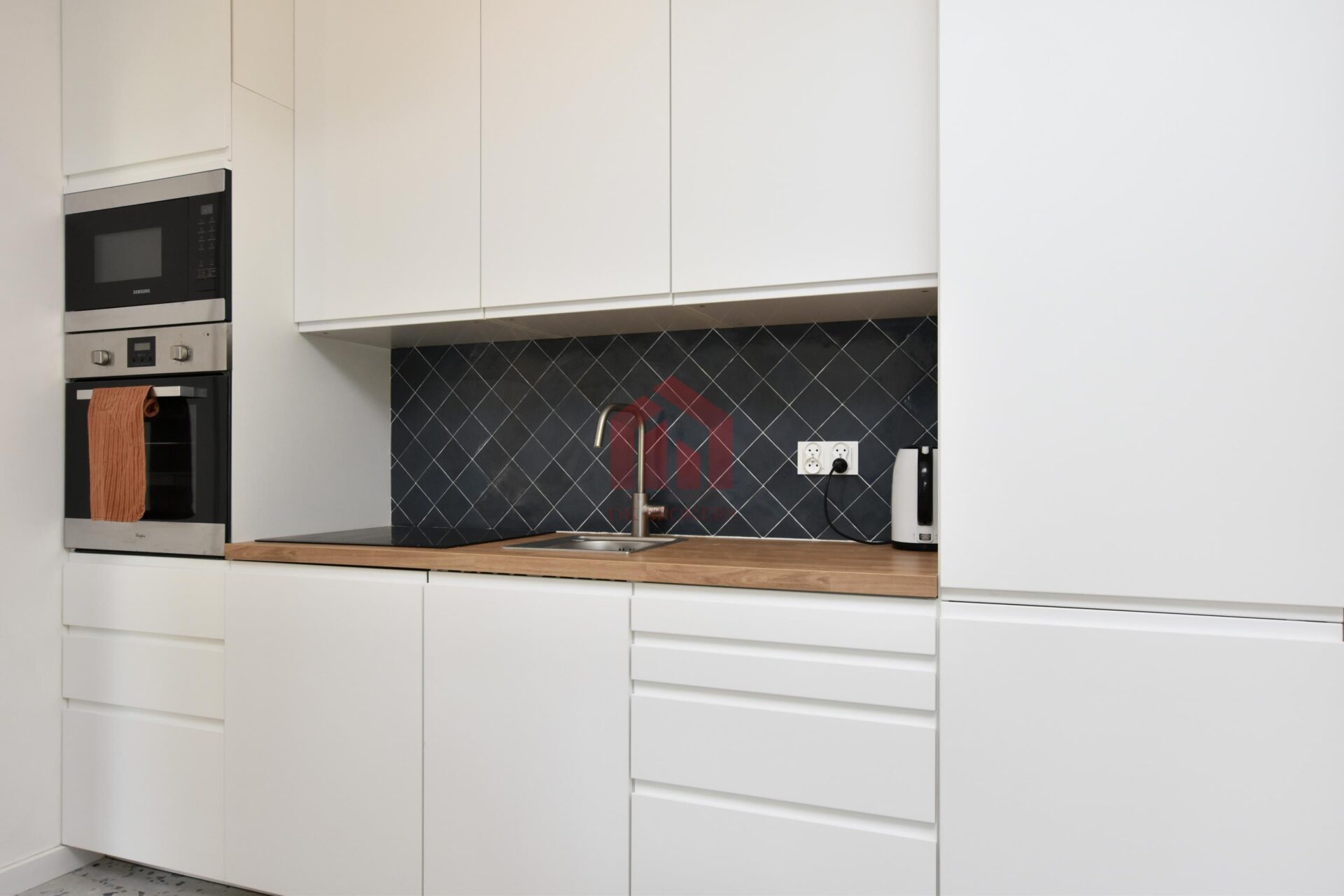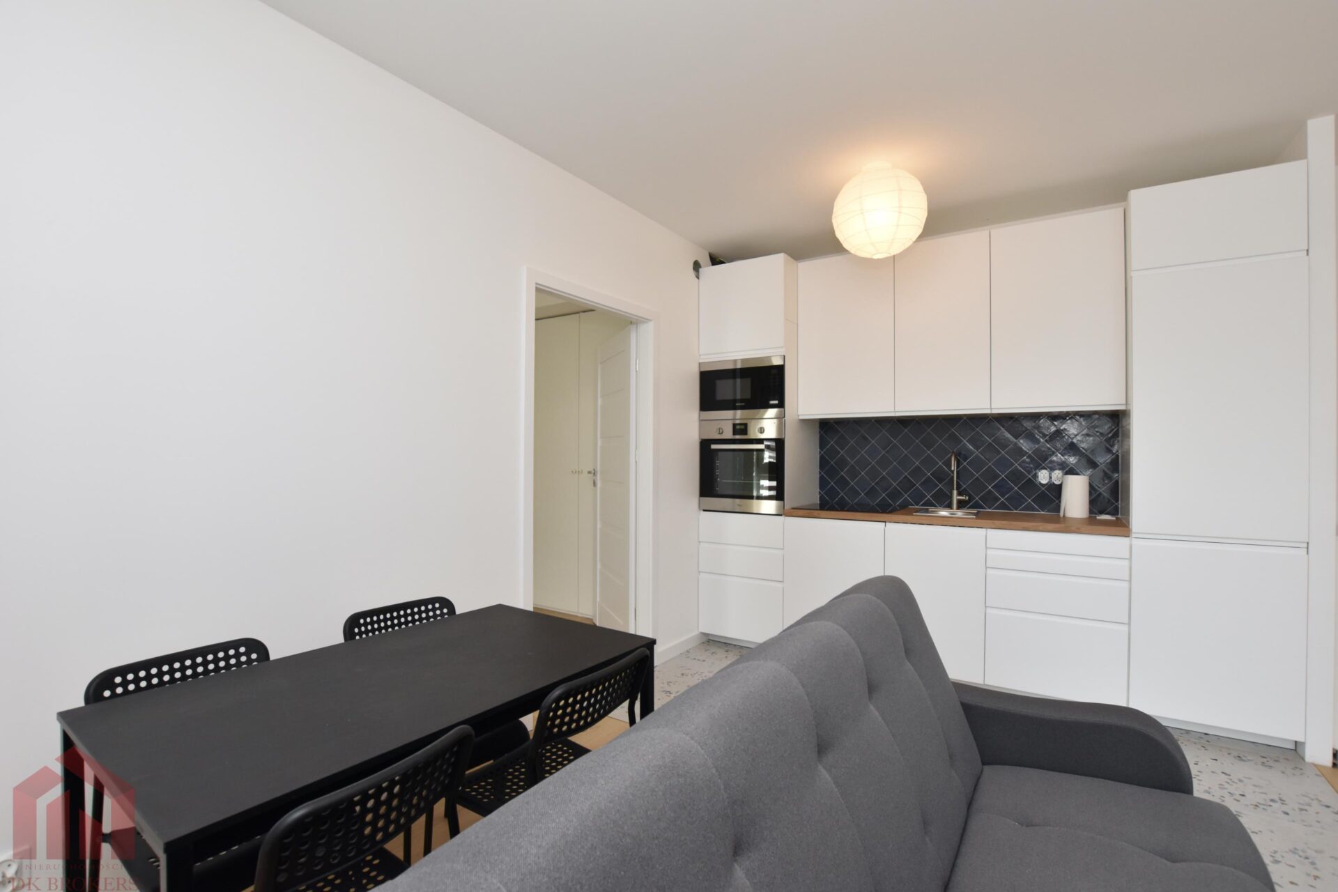 Kuchnia kompletnie wykończona i wyposażona w niezbędny sprzęt AGD (lodówkę, piekarnik, płytę indukcyjną, zmywarkę).