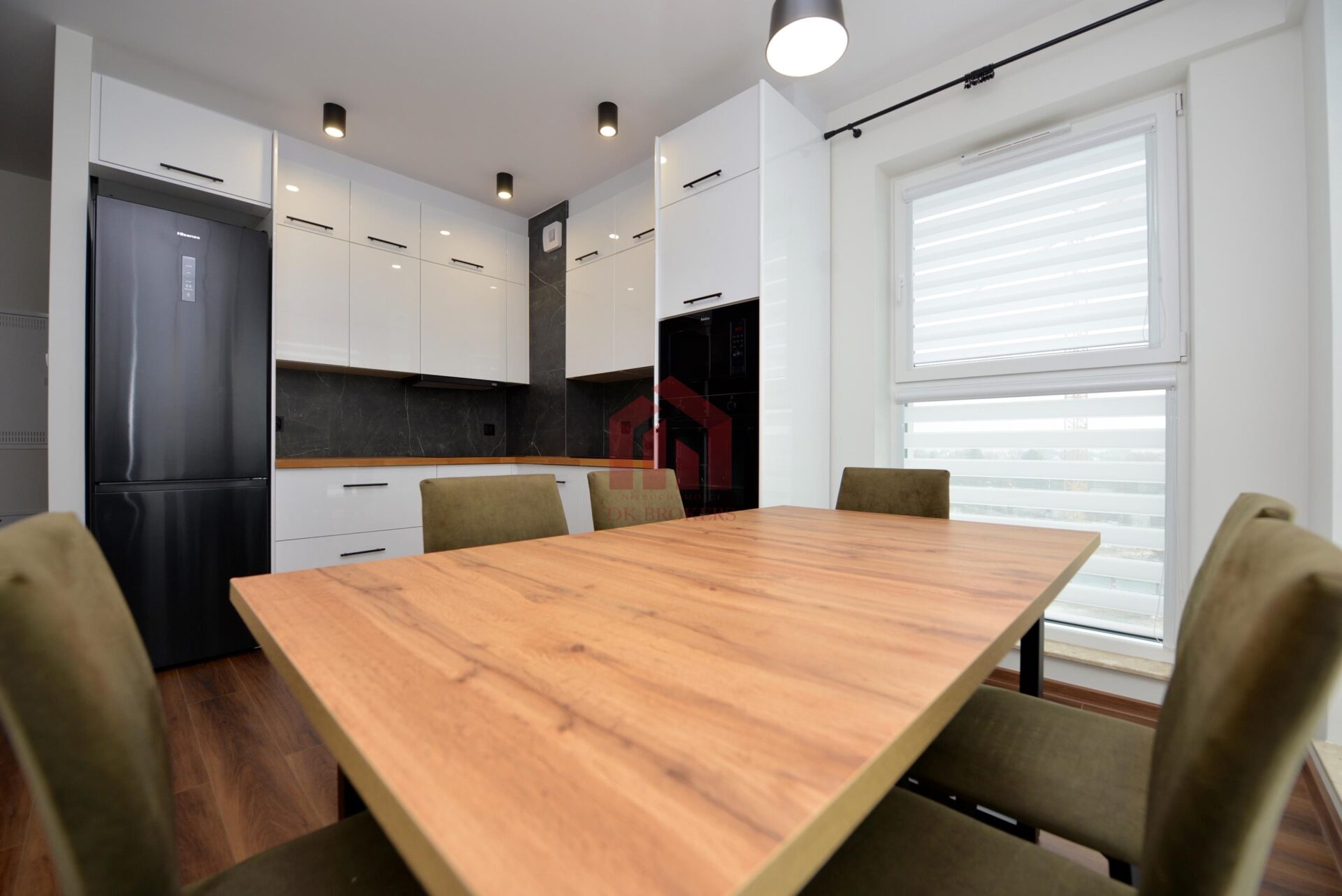 Kuchnia kompletnie wykończona i wyposażona w niezbędny sprzęt AGD (lodówkę, piekarnik mikrofalówkę i płytę indukcyjną).