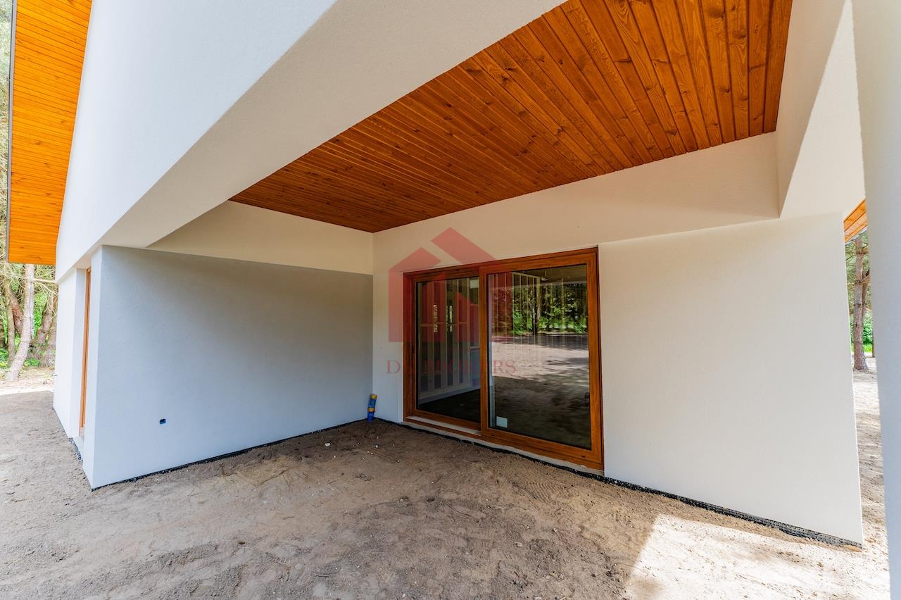 Przytulna bryła domu oraz harmonijna kolorystyka, utrzymana w odcieniach bieli i wykończenia z naturalnego drewna doskonale komponują się z otaczającym krajobrazem sosnowego lasu.